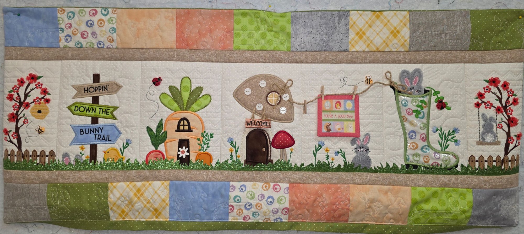 | Requirements: | Hoppin Down the Bunny Trail Embroidery Pattern Hoppin Down the Bunny Trail Embellishment Kit Hoppin Down the Bunny Trail Quilting Bundle Embroidery threads Fabrics per pattern Sewing machine capable or embroidery Machine accessories Thread snips Fabrics - your choice per pattern directions |